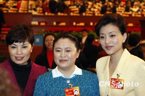 3月7日,全国政协十一届三次会议第二次全体大会在北京人民大会堂举行,16名政协委员进行大会发言。图为会前,杨澜、张秋俭、李瑞英委员(右至左)合影留念。中新社发 张宇 摄