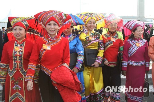 3月5日,十一届全国人大三次会议在北京人民大会堂开幕。身穿民族服饰的女人大代表走入会场,成为两会一道亮丽的风景。中新社发 韩苏原 摄