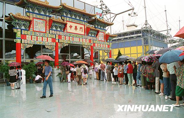 大田世界博览会中国馆前,观众冒雨等候进馆参观。张忠义摄