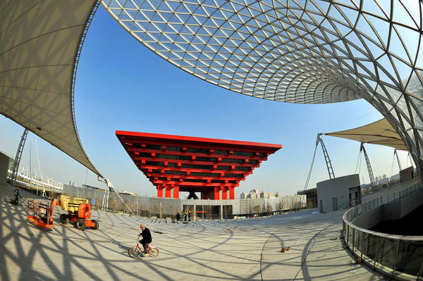 2010年1月21日上海迎来世博会开幕倒计时100天。世博会场馆建设进入最后冲刺阶段,部分场馆已形象初显。图为建设中的上海世博会世博园区