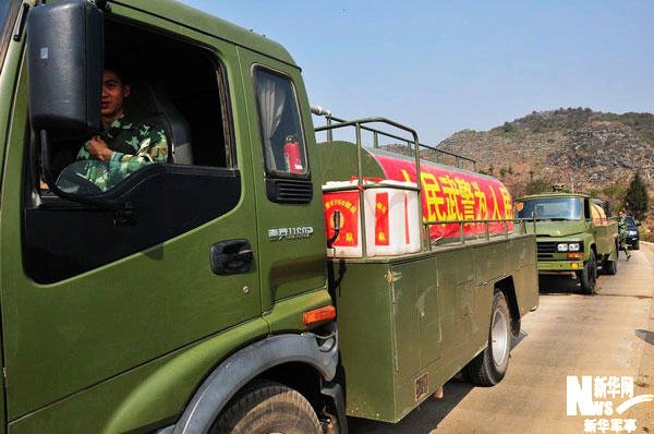 女子服务队每次都要乘坐水炮车去送水,目前武警8750部队已经出动20辆水炮车抗旱。本文图片由刘昕、杨雷、吴邦纯、贾松基拍摄