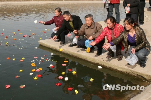 4月2日,河南省安阳市组织市民群众来到安阳母亲河——洹河岸边,以抛洒鲜花的形式祭奠革命先烈,倡导文明祭祀方式,践行“低碳”生活。中新社发 王龙 摄