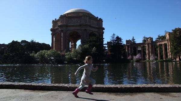 2010年2月8日,一名儿童在1915年美国旧金山巴拿马太平洋世博会遗址旁的公园玩耍。 1915年旧金山巴拿马太平洋世博会是为纪念巴拿马运河开通而举办的。仿古罗马废墟风格的艺术宫是这届博览会留下的唯一现存建筑。如今已成为当地地标性建筑,环绕四周的是一个开放式的社区公园,和整个城市以及市民生活融为一体。