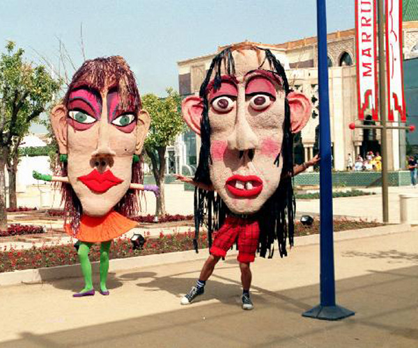 这是在1992年西班牙塞维利亚世界博览会上,两个“大头人”表演吸引游客。塞维利亚世博会于1992年4月20日开幕,包括中国在内的110个国家、23个国际组织以及西班牙17个自治区和6家工业集团参展。