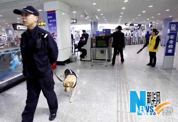 4月19日,在上海世博园浦西园区入口的西藏南路地铁站,安保人员带着警犬巡逻。刘颖 摄