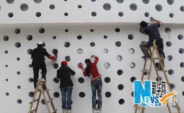 4月19日,几名保洁工人正在清洁丹麦馆的外墙。 裴鑫 摄