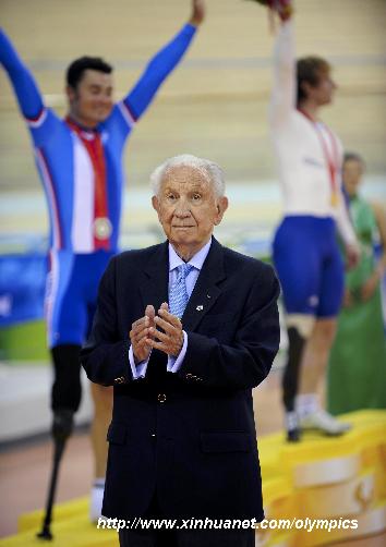 2008年9月9日,萨马兰奇出席北京2008年残奥会场地自行车男子1公里计时赛(LC2)颁奖典礼并为前三名运动员颁奖。图片来源:新华网