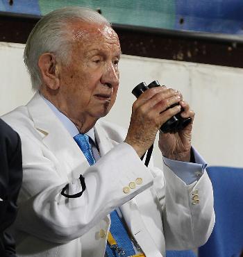 2008年8月14日,国际奥委会终身名誉主席萨马兰奇在中国香港观看奥运马术盛装舞步团体赛决赛的资料照片。图片来源:新华网