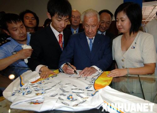 2007年6月24日,国际奥委会终身名誉主席萨马兰奇(右三)为一名收藏爱好者在衣服上签名。当日,第十三届世界奥林匹克收藏博览会开幕式在北京举行。图片来源:新华网 罗晓光 摄