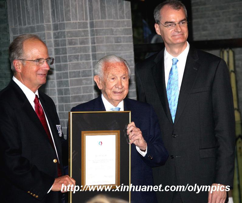 2008年8月10日 萨马兰奇因鼓励“奥林匹克休战”在北京获得国际奖章 8月10日,国际奥委会终身名誉主席胡安·安东尼奥·萨马兰奇在北京获得美国休战基金会颁发的特别奖项,该基金会称赞萨马兰奇推广“奥林匹克休战”理念,为世界和平做出了巨大贡献。图片来源:新华网 汪永基 摄