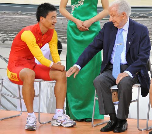 2008年9月9日,国际奥委会名誉主席萨马兰奇(右)在颁奖仪式前与铜牌获得者中国选手郑元超亲切交流。图片来源:新华网 何俊昌 摄