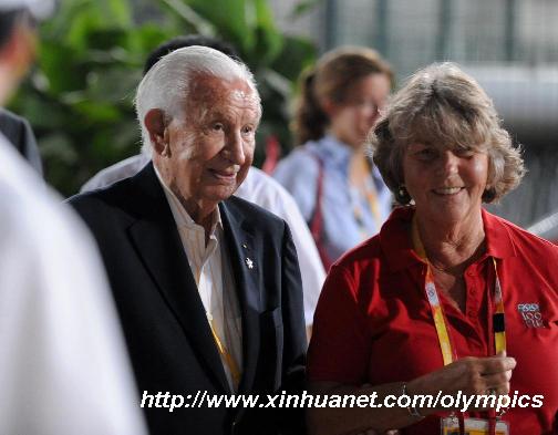 2008年8月11日,前国际奥委会主席萨马兰奇(左)观看完比赛后离开。当晚,国际奥委会主席罗格和前国际奥委会主席萨马兰奇来到北京奥运会曲棍球比赛赛场,观看西班牙队对比利时队的比赛。图片来源:新华网 王长山 摄