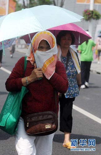 6月30日,一名“全副武装”的游客行走在世博园内。燕雁 摄