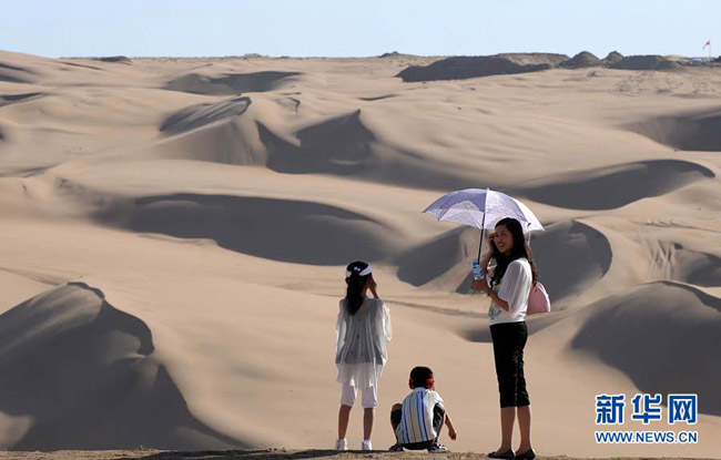 6月28日,游客在内蒙古库布齐沙漠恩格贝旅游区避暑休闲。连日来,内蒙古部分地区持续高温酷暑天气,最高气温超过35摄氏度,人们纷纷走出家门、在公园绿地避暑纳凉,城市周边旅游景区迎来接待高峰。气象部门已经发布高温蓝色预警信息,提醒广大市民群众做好安全生产和防暑准备工作。张领 摄