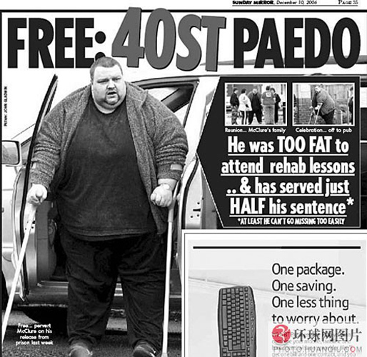体重254公斤的英国男子弗莱德里克·米克路尔三年前由于猥亵儿童被判监禁5年,然而由于弗莱德里克太胖,狱方不得不花重金请人来照顾他,直至上周,不堪重负的狱方甩掉了这个“大包袱”,将他提前释放。