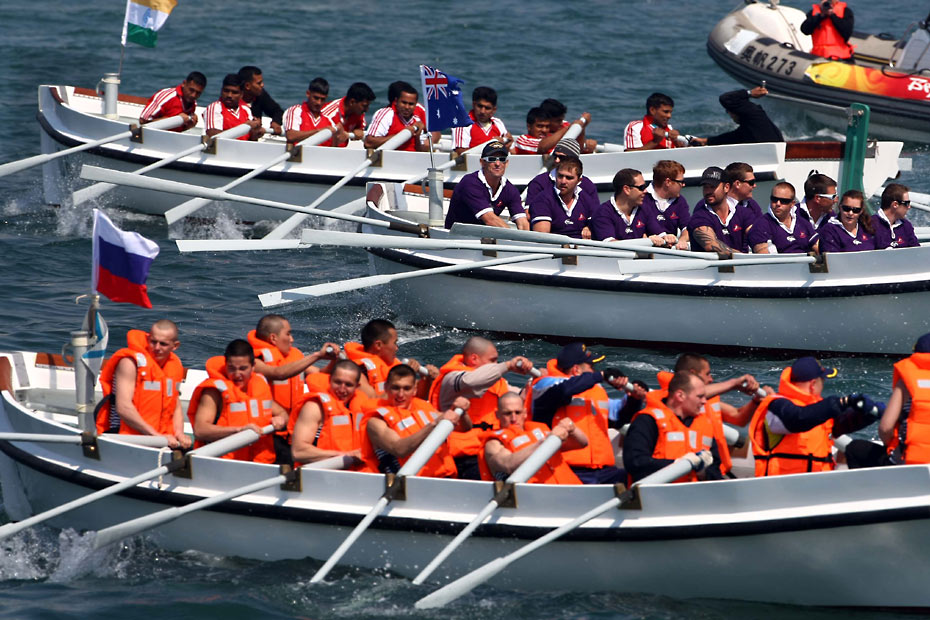 4月21日,为庆祝中国人民解放军海军成立60周年,来自法国、俄罗斯、韩国及东道主中国等12个国家的13支代表队在青岛举行舢板比赛。中新社发 宋吉河 摄