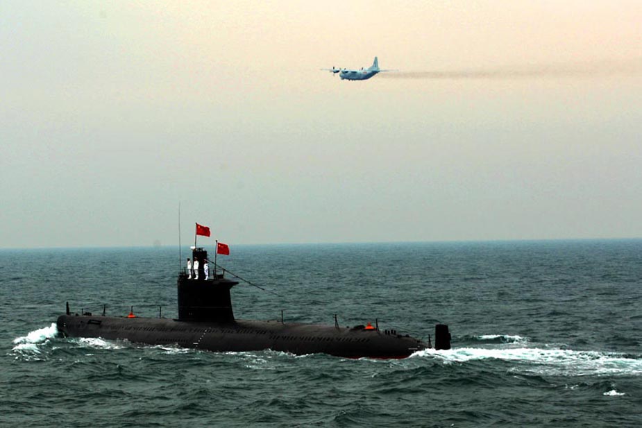 4月23日下午,为纪念中国人民解放军海军成立60周年而举行的海上阅兵在青岛附近黄海海域举行。长征6号、长征3号核动力潜艇和长城218号、长城177号常规动力潜艇依次接受检阅。 中新社发 宋吉河 摄