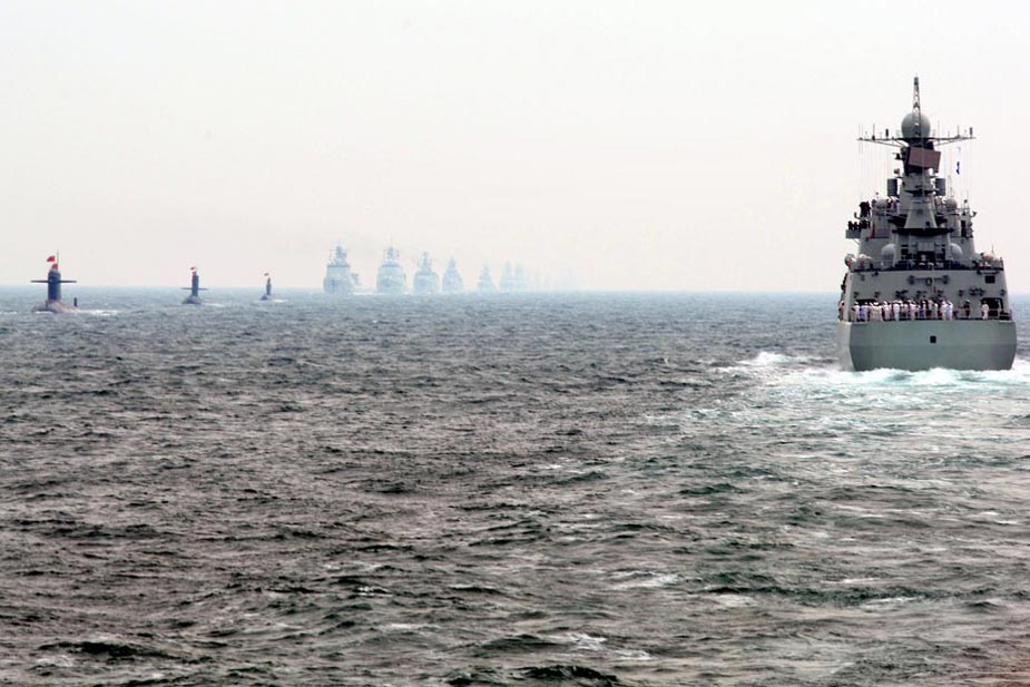 4月23日下午,为纪念中国人民解放军海军成立60周年而举行的海上阅兵在青岛附近黄海海域举行。海上检阅式分两个阶段,第一阶段为海上分列式,检阅中国海军的舰艇和飞机;第二阶段为海上阅兵式,检阅来自14个国家的21艘舰艇。中新社发 宋吉河 摄