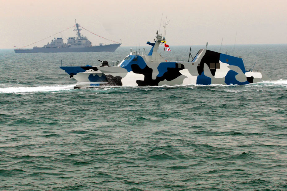 4月23日下午,为纪念中国人民解放军海军成立60周年而举行的海上阅兵在青岛附近黄海海域举行。海上检阅式分两个阶段,第一阶段为海上分列式,检阅中国海军的舰艇和飞机;第二阶段为海上阅兵式,检阅来自14个国家的21艘舰艇。图为中国海军新型导弹快艇接受检阅。 中新社发 宋吉河 摄