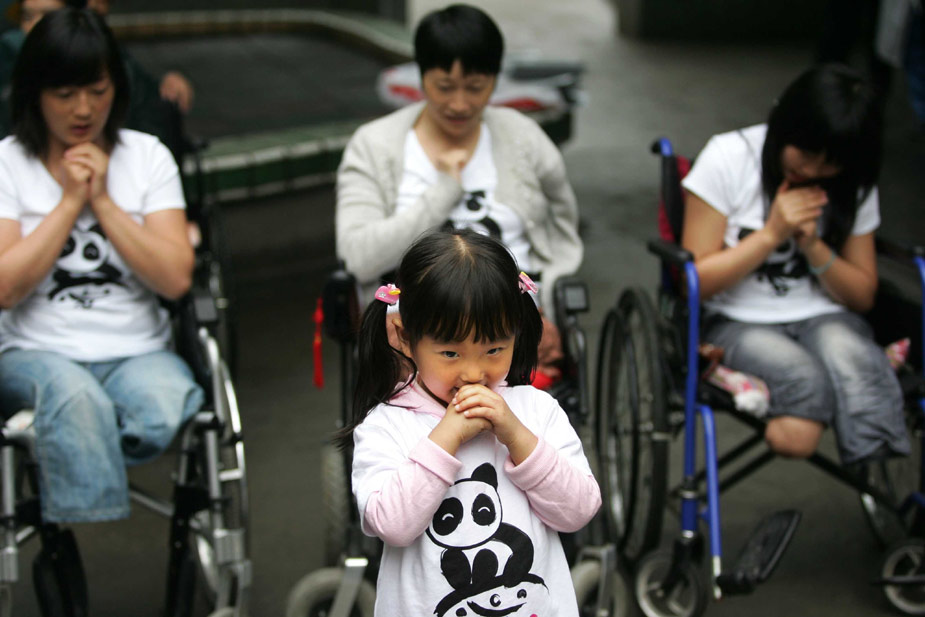 5月7日,小朋友王诗琪(前)及母亲杨兰(后左)还有几位肢残患者一起用手语演唱“感恩的心”。这对母女是汶川人,在大地震中女孩的父亲不幸遇难,母亲失去的双腿,在康复中心杨兰得到了全面的治疗。四川大地震一周年之际,共计几十家境内外媒体的记者走进位于四川省人民医院内的地震伤员康复中心。该中心去年六月二十三日成立后到今年四月三十日新收治地震伤员二百三十四人。中新社发 富田 摄