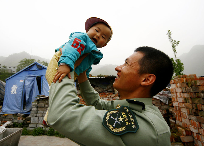 2009年4月下旬,解放军官兵回到08年地震参加救援的重灾区什邡市蓥华镇、红白真镇、洛水镇,看望慰问当地群众,祭奠遇难者。 中新社发 钟 敏 摄