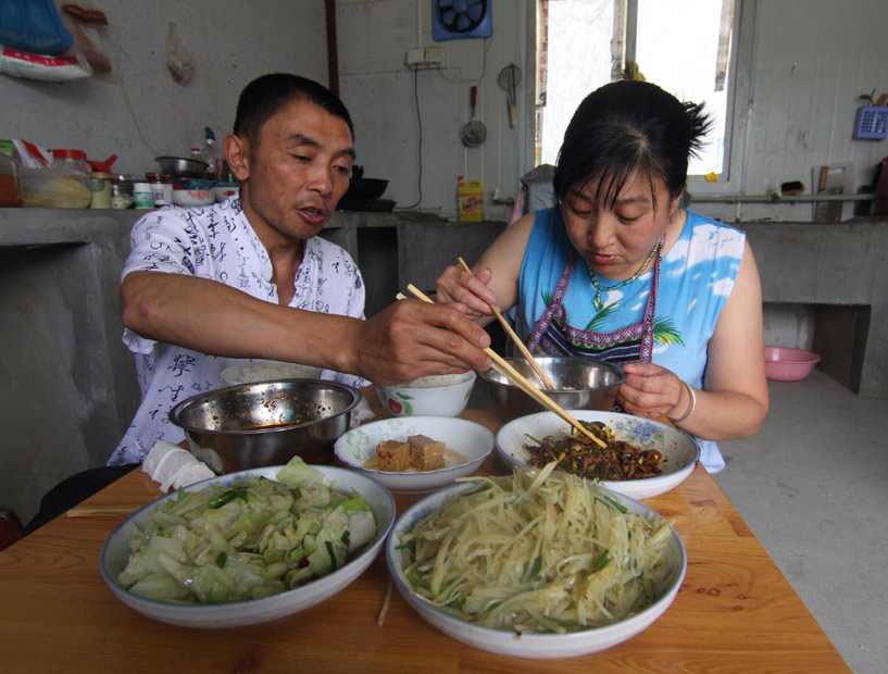 5月4日,北川县曲山镇永兴板房里的重组夫妻尹华均和妻子朱云翠一起吃饭。在“512”地震中失去亲人的他,重获美满的家庭。 尹华均在曲山镇回龙社区担任组长,在地震中失去了妻子的他幸运的遇见了同在地震中失去亲人的朱云翠,并缔结良缘。中新社发 郭国权 摄
