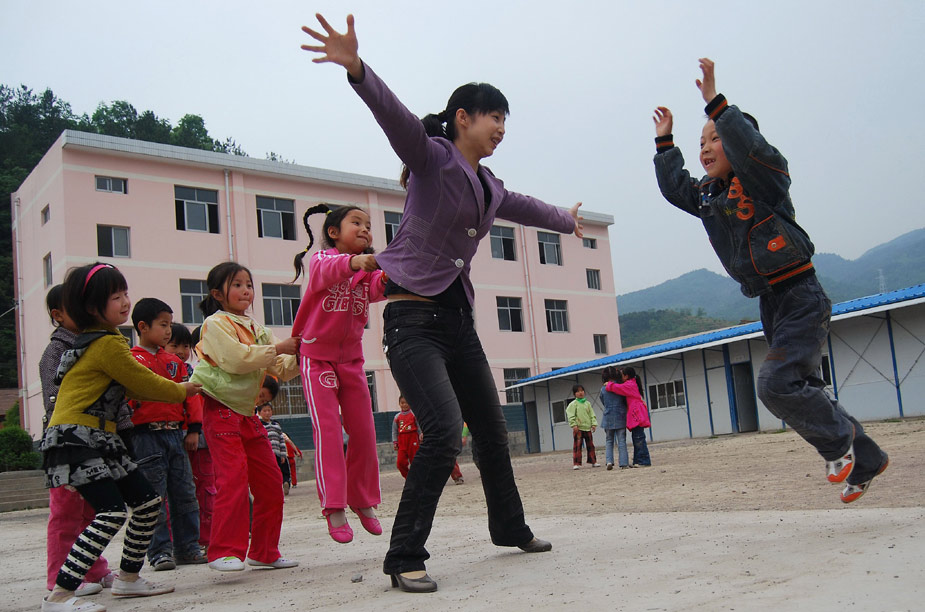 2009年5月4日,全国抗震英雄---陕西宁强黄坝驿乡中心小学教师王敏,正在和学生们一起做老鹰抓小鸡游戏,用欢笑声驱散了地震带来的阴霾。当日她荣获第十三届“中国青年五四奖。”