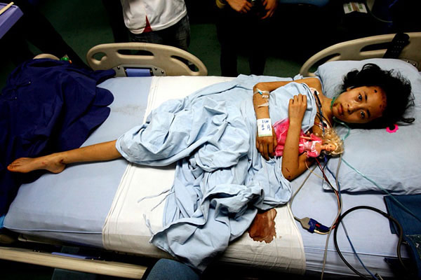 2008年5月18日,在四川省绵阳市第四十四医院的重症监护室,11岁的李月在病床上。李月的理想是当芭蕾舞蹈家,地震让她失去了一条腿。 作者:郭铁流 中国