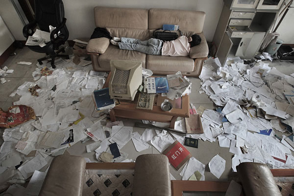 2008年10月14日,一位催讨债务的男子在江龙集团销售办公室睡觉。受全球金融海啸影响,国内最大的印染企业江龙集团资金链断裂,企业老板出逃,大批债权人来到集团总部讨债。作者:傅拥军 中国