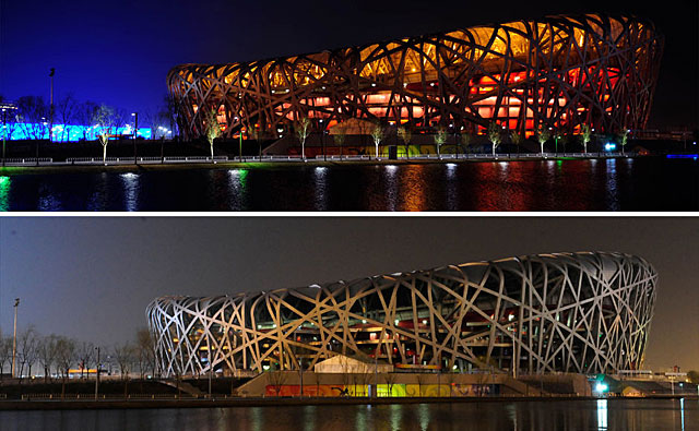 中国北京。3月28日,熄灯前后的国家体育场“鸟巢”。