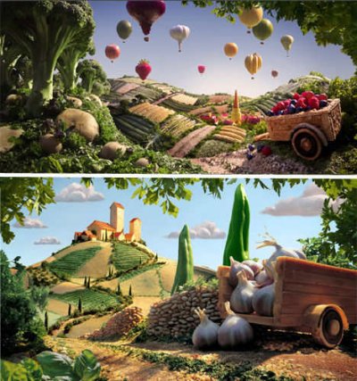 10、可食风景 45岁的英国摄影师卡尔·华纳以蔬菜、肉类、奶制品以及鱼类产品为原料,搭建出了很多幅靓丽的、栩栩如生的风景画。他先在头脑中勾勒出了一幅幅景象,然后再去买原料,并用曲别针和强力胶水将它们粘合在一起。他用三文鱼肉做海,椰菜当树,面包做山,奶酪当屋,牛肉变雪景,就这样,创造出了"椰菜森林","奶酪山庄","蔬果热气球嘉年华"、"牛肉天堂"等美轮美奂的作品。若不是使用了一些化学原料,而且创造周期太长导致食物变质,否则你真的可以一一"品尝"这些风景了。