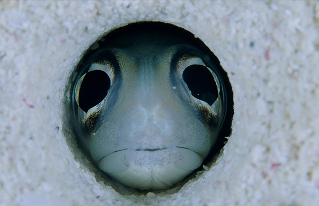 谁正在盯着你?一条海鳗正在古巴附近的加勒比海中的沙穴里向外凝视。这种诡异的动物喜欢白天躲藏起来,夜间才出来觅食。