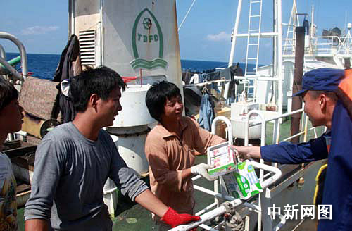 舰船分航前,“海口”舰通过靠帮方式,向“天裕八号”渔船派出医护人员,对渔船船员进行了身体检查,并送去一些常用药品。