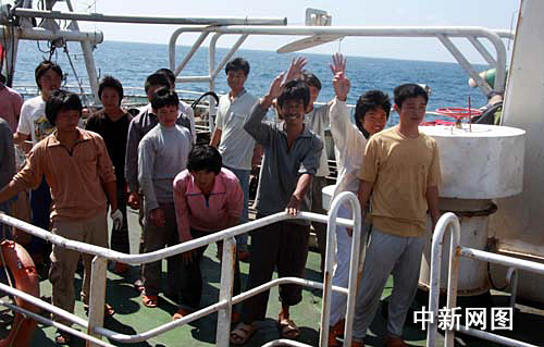 当地时间二○○九年二月十一日上午十时许(北京时间下午十五时许),获释的中国渔船“天裕八号”在中国海军护航编队“海口”号导弹驱逐舰的伴随护卫下,顺利抵达安全海域。