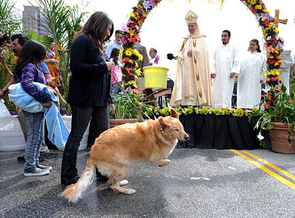 4月11日,在美国洛杉矶人们欢庆复活节的同时,也为他们的宠物举行了祝福仪式。这项祝福仪式每年举行一次,今年第一个被祝福的是农场里的动物。