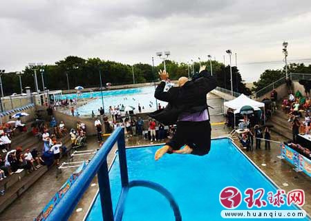 加拿大多伦多举行的“深水炸弹”跳水比赛。在“深水炸弹”比赛中,参赛者以各种不同造型、姿势从5米高台跳入水中,溅起水花最多者为胜。