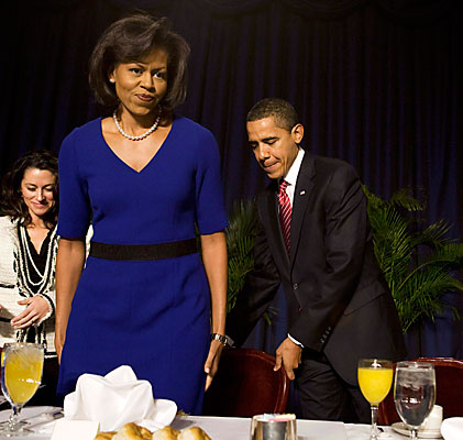 2月5日,在华盛顿举行的全国祈祷早餐上,奥巴马总统为其夫人搬凳子。