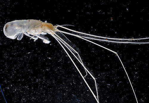科学家借助科考机器人,在2000米深的西里伯斯海捕获了一种长约3厘米,和普通药片差不多大小的等足目生物。与短小的身体不相符的是它那修长的腿,看起来好似在水中“探路”。