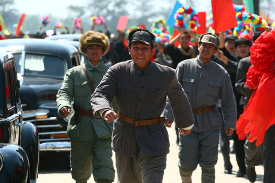 刘烨饰演一位醉酒大闹阅兵式的无名老兵,在向毛主席敬礼时展现了庄严凝重的气势,该角色在史书中有原型,但电影中的台词与表现进行了艺术化处理。为了在本戏中出演,刘烨特意停下手头正在拍摄的电视剧赶到现场。他笑言这次的赶场很值得,原先一句台词改成了几句句,还可以在两大导演面前一个人明目张胆地喝酒。为了在片中表现出喝醉的状态和混不吝的个性,刘烨在现场干了一瓶啤酒,将历尽千辛,百战归来的老兵演绎得十分生动,一句“代表活着的、死了的战士向毛委员敬礼”振聋发聩,其后高唱军歌的场面也十分动人。韩三平为这场戏亲自掌镜,并叮嘱刘烨要在激昂中表现出对“古来征战几人回”的压抑和辛酸。最后的结果让两位导演对刘烨实拍中的表现赞不绝口。