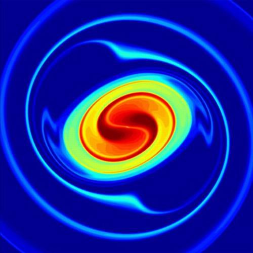 这幅漩涡作品中,二维流体涡相互吸引、旋转、合并,像在跳芭蕾舞。通常大气中的气候模式或核聚变装置中才会出现这一现象。先进的数值算法和高性能的超级计算机可以模拟湍流漩涡的所有细节。这幅作品捕获的是漩涡旋转过程的一瞬间。它们盘旋并互相结合,如果观察足够长的时间,会发现就像在跳一支华尔兹舞。