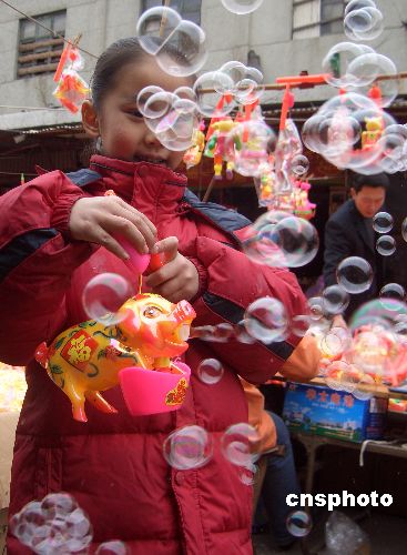 2月24日,一位小朋友在枣庄市振兴市场展示会“吹”泡泡的猪花灯。当日,山东省枣庄市振兴市场为了迎接即将到来的元宵佳节,销售摊点推出一种会“吹”泡泡的猪花灯,特别受小朋友喜欢。中新社发 吉 喆 摄