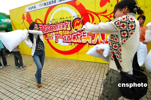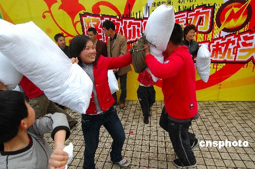 4月1日,浙江经济台举办的“释放你的压力——枕头大战”在杭州吴山广场上演,十余名男女青少年人手一个枕头“开打”。随着社会竞争的日益激烈,都市人的自我心理压力日趋严重,如何进行自我心理调节十分必要。“枕头大战”让组织者及参与者以这种特殊方式向心理压力进行挑战。中新社发 引炜 摄