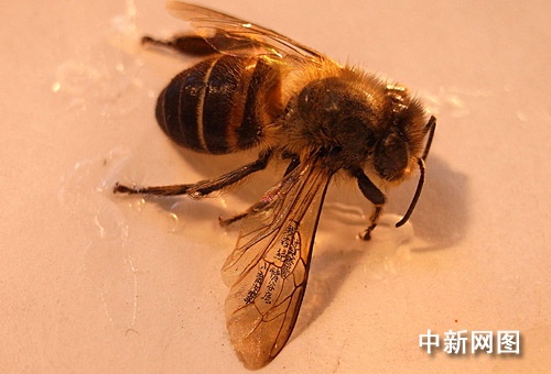 台湾著名微雕家陈逢显最近在一只蜜蜂标本的翅膀上写下了金庸武侠小说《神雕侠侣》中的一句话“过儿吾爱,我在绝情谷底,小龙女笔”十四个微小字。图为作品。中新社记者 陈立宇 摄