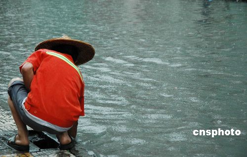 7月21日下午,一场暴雨不期而至降落在浙江台州市区。近1个小时的降雨,使市区道路多处积水,给市民出行带来不便。中新社发 (郏策) 摄