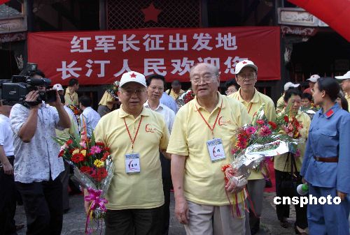 7月21日,20多位开国元勋子女在红军长征出发地之一的福建长汀受到热烈欢迎。“情系长征路——开国元勋子女重走长征路”活动当日晚间从红军长征出发地福建宁化抵达另一红军长征出发地长汀,继续重走长征路活动。中新社发 田地 摄