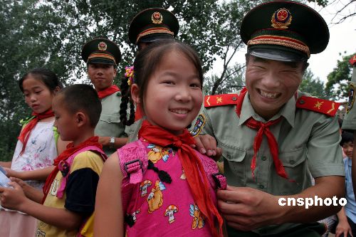 7月24日下午,淮北市烈山区宋疃镇店孜村贫困儿童刘志恒背上武警叔叔送来的新书包。当天,淮北武警战士情系贫困儿童接对仪式在烈山区宋疃镇店孜村农家小院举行,战士们带着学习用品与店孜村的10名贫困儿童接成帮扶“对子”。中新社发 李博 摄