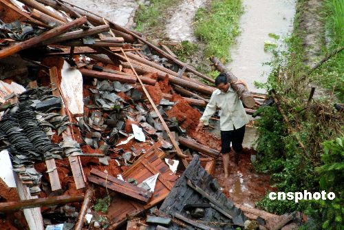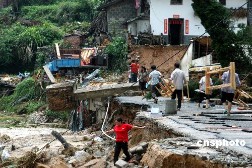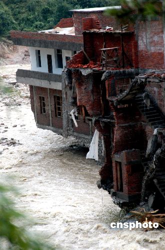 7月26日上午,江西上犹县,一栋楼房悬在洪水中。今年第5号台风“格美”进入江西,在赣南上犹县造成山洪暴发、山体滑坡。截至当日16时的不完全统计,洪灾已在上犹县造成5人死亡、20多人失踪。25至26两天降水280毫米。当地政府已经组织各级抗洪抢险,转移群众数万人。当地部队、武警投入冲锋舟抢险,但由于雨大暂时无法使用。中新社发 龙胜 摄