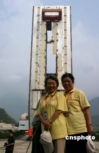 8月11日,开国元勋子女在四川西昌卫星发射基地参观。图为周恩来侄女周秉德(左)与秦邦宪儿媳郭少妹在发射架前合影。8月10日,“情系长征路——开国元勋子女重走长征路”一行抵达70年前中央红军长征到过的凉山。中新社发 田地 摄