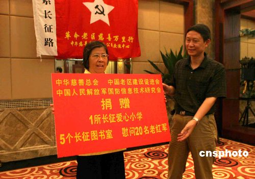 八月十五日,纪念红军长征胜利七十周年“情系长征路革命老区慈善万里行”捐赠仪式在四川省会成都举行,任弼时之女任远征代表重走长征路的开国元勋子女和中华慈善总会、中国老区建设促进会、中国人民解放军国防信息技术研究会,向四川省慈善总会捐赠一所长征爱心小学、五个长征爱心图书室,并慰问二十名老红军。中新社发 田地 摄