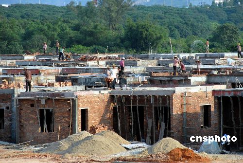 8月15日,福建省漳浦县大南坂农场上埔作业区重建点现场一派繁忙施工景象,工人正在装修房屋主体。上埔作业区是规模较大的集中重建点,目前50户安置房的主体工程基本完成,灾民将在9月30日前住上新居。中新社发 蓝智伟 摄